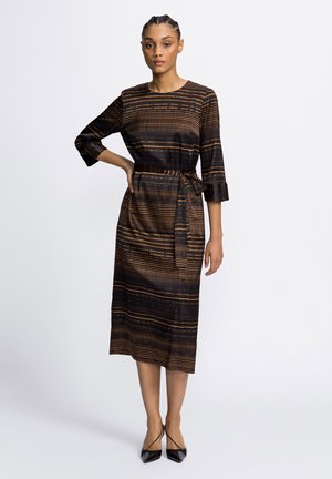 Beige Striped Women S Dress Classic Shirt Collar Stylish Beige Dress New Season Special Fabric Beige Women S Dress Long Sleeved Comfortable Casual Dress Striped Beige Dress Made Of Polyester Cotton Blend Produced In Turkey